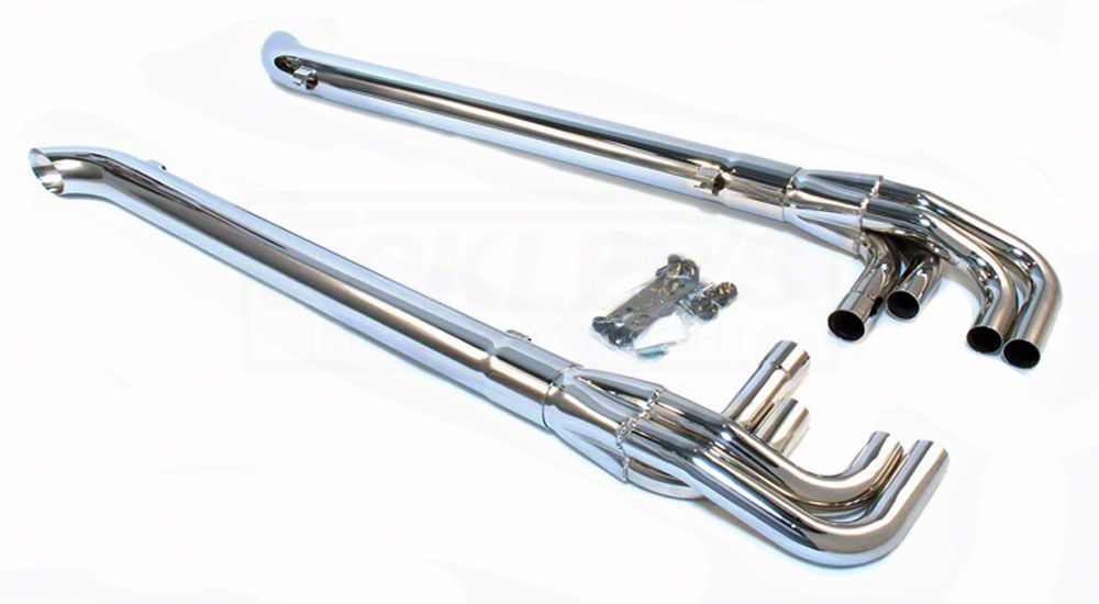 Lake pipes from Ecklers Chevelle will give your 1964-1977 Chevelle or Malibu the look of expensive side pipes without breaking the bank. This Chrome Lake Pipe '4' kit will connect to your headers or even stock exhaust with slight modifications and feature one inlet pipe and three dress up tubes. The built in hi-flo six sided louvered core mufflers tame the decibels but not the horsepower. The preinstalled brackets allow easy installation. Take your Chevelle or Malibu to the next level with chrome Lake Pipes from Ecklers Chevelle. Lake pipe kit is great for custom exhaust applications for Chevelle or Malibu 1964, 1965, 1966, 1967, 1968, 1969, 1970, 1971, 1972, 1973, 1974, 1975, 1976, 1977. Trust Ecklers Chevelle for all your parts needs.