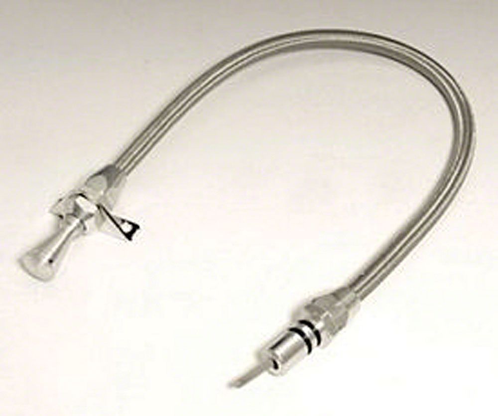 You have flexibility with this Teflon-lined Flexible Braided Stainless Transmission Dipstick. Kit comes complete with braided stainless outer housing and heat resistant E-Z to read flexible inner dipstick measuring cable. Inner cable is molded with appropriate trans fluid levels. Billet aluminum handle and billet aluminum fittings complement Lokar’s Flexible Engine Dipsticks. Kit includes dipstick funnel adapter to assist in filling. Designed for “push in” style transmissions. Dipstick seals with double O-rings. Firewall mount measures 24" in length. Transmount mounts to the bell housing and the length varies according to the transmission application. Kit comes complete with installation instructions.