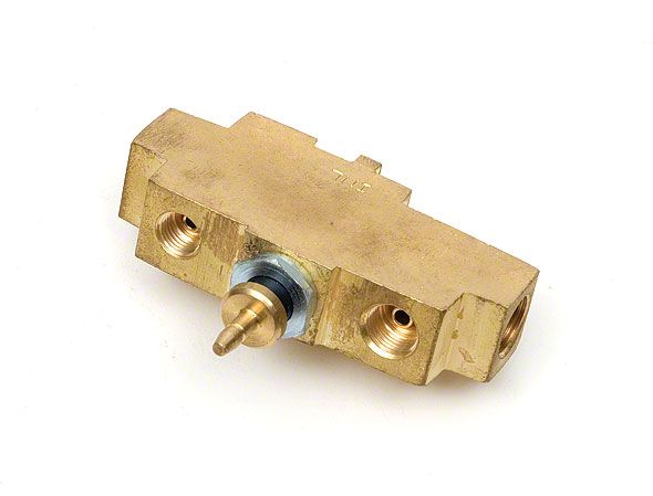 This block was used on all cars, either disc or drum, and is located down on the frame below the master cylinder. This is not a proportioning valve because it does not modulate pressure. If there is a loss of pressure in either the front or rear braking systems, it will activate the brake warning light in the dash. From 1968-72 this block was used on all drum brake cars and with the round hold off valve at the master on disc brake cars from 1967-70. In 1971, disc brake cars used a one piece proportioning valve and the drum brake applications continued to use the distribution block. This block provides equal pressure to the front and rear brakes so it is also great for 4 wheel disc applications. 1968-69 and 1970-72 are very similar blocks except the fitting sizes change for the different pr