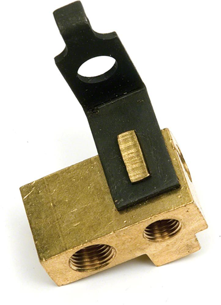 This tee is the brake line distribution block that feeds the entire braking system. The block mounts to the frame and the single master cylinder line screws into the top while the left and right front screws to the sides and the front to the rear screws into the back. These block are often discarded with the old lines. Often these blocks are missing, thrown away, or striped. These are the exact reproduction of the originals down to every detail. They are the correct size, shape and thickness brass.