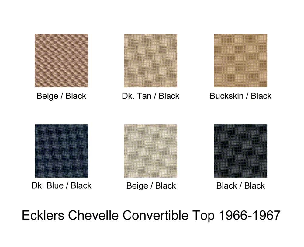 The convertible top on your 1966-1967 Chevelle can become dingy and shabby looking over tie. Tree sap, pollutants, harsh chemicals and even sunlight make your top less pliable. Small tears can form from the scissor action of the top frame causing small but damaging leaks. Eckler's Chevelle knows the importance of keeping your classic looking good. That's why we offer this superior replacement convertible top for your restorarion. These premium convertible tops are computer cut for a precise fit. The 36 ounce pinpoint vinyl or stayfast canvas is dielectrically sealed for durabilty. Extra touches include sateen bow sleeves and super strong polyester thread is used for all stitching. Don't let an aging convertible top take away from your classic 66 o