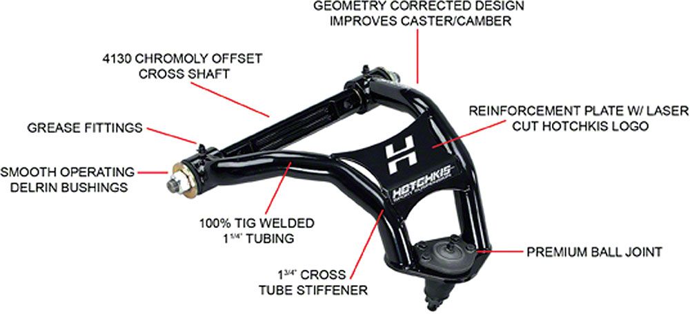 Install the Hotchkis Sport Suspension Geometry Corrected Tubular Upper A-Arms on your Chevelle and gain vastly increased handling and control. These TIG welded; bolt-on control arms offer premium quality construction for ultimate performance and a great look. Smooth operating polyurethane bushings in the 4130 billet cross shaft allow the a-arms to move through their travel easily. Finished in gloss black powder coat, the arms are ready to install and are complete with premium ball joints and polyurethane droop stops. Easy installation with no vehicle modifications required. For even greater handling improvements combine with the Hotchkis Performance Tubular Lower A–Arms.