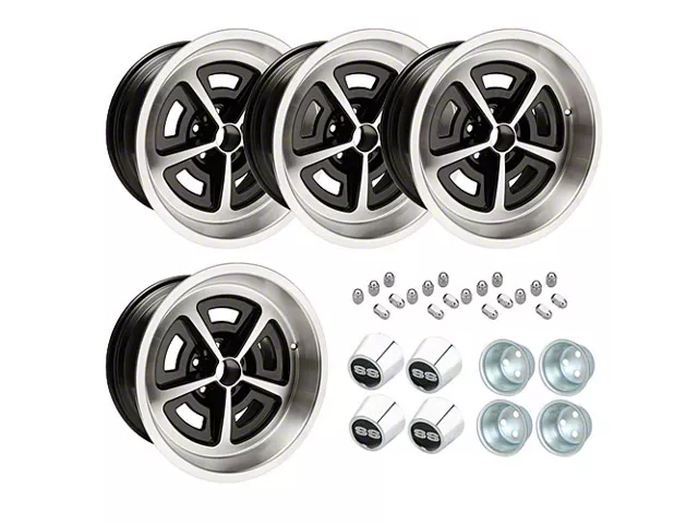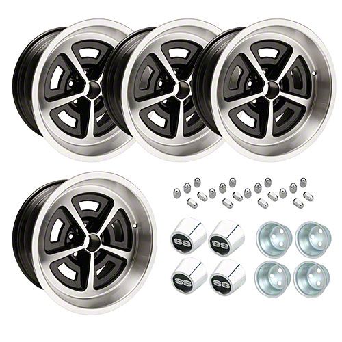 Give your classic an upgraded old school musclecar look with 17" cast aluminum Magnum Wheel.These wheels allow you to step up to a Z-rated 40-series tire with a square shoulder. They will dramatically improve your driving experience with shorter stops, more steering feel with quicker response and more confident and predictable handling. This wheel is constructed of one piece cast aluminum with a machined lip. A durable black powder coating looks great for the long haul.. Trust Eckler's Chevelle for all restoration and performance parts needs!