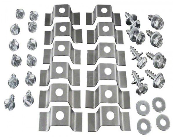 Construction and Appearance. This kit includes brackets and screws manufactured to original factory specifications, ensuring exact fitment and compatibility. The components feature a durable finish designed to match the original styling and provide longevity through reliable material quality.