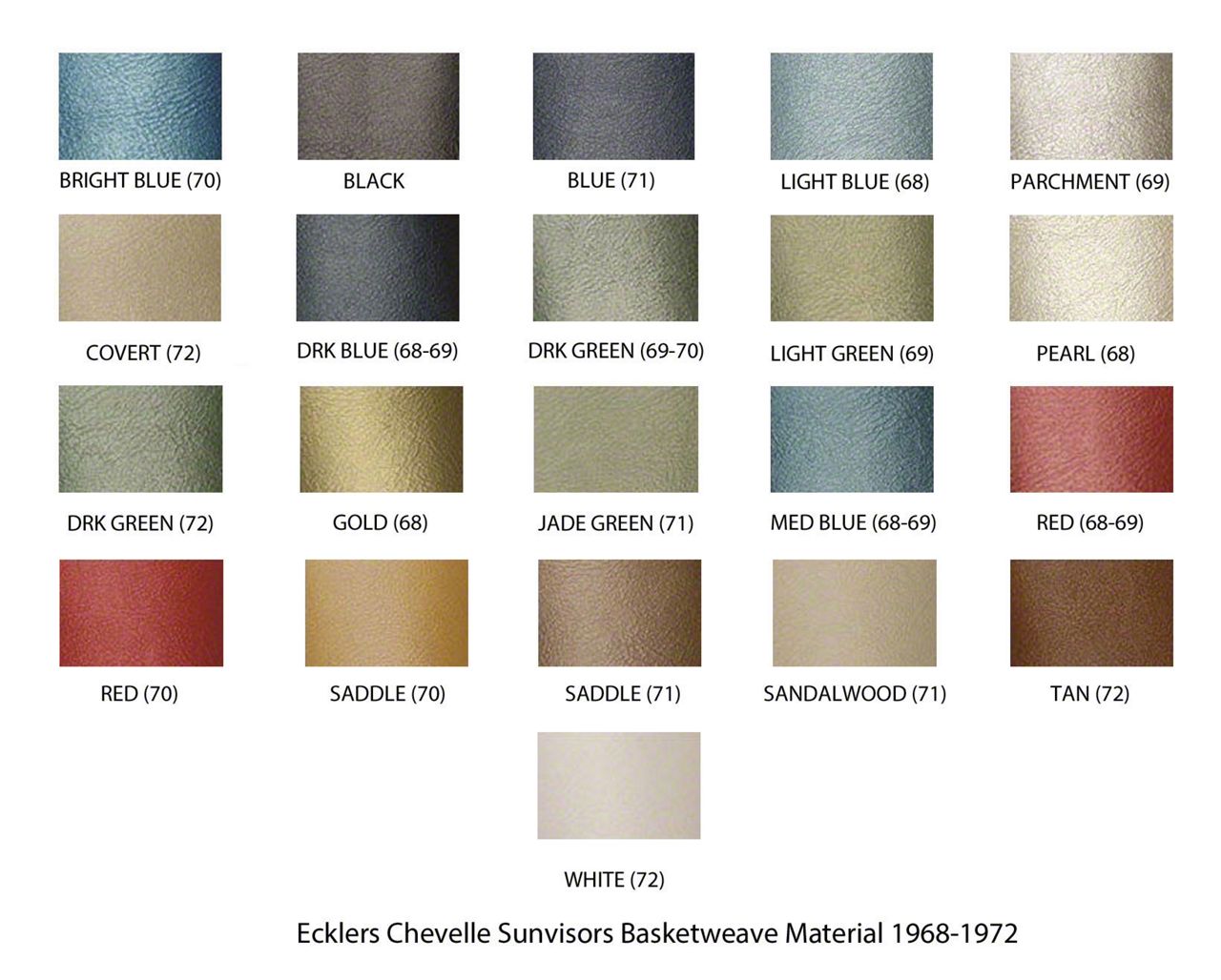 Each pair of new reproduction 1968-72 Chevelle sunvisors comes presewn on new boards, using the correct color material and pattern. In some cases replacement style material must be used, however, every effort has been made to keep your new visors as original appearing as possible. These visors are correctly constructed from automotive cardboard with metal rods that are welded into a metal sleeve for strength and durability. The edges of the padding and vinyl are dielectrically heat sealed to ensure a factory fresh look. End the hassle of trying to recover those old visors, order your new visors today from Ecklers Chevelle & Malibu. Fits: 1968, 1969, 1970, 1971, 1972 Chevelle Convertible