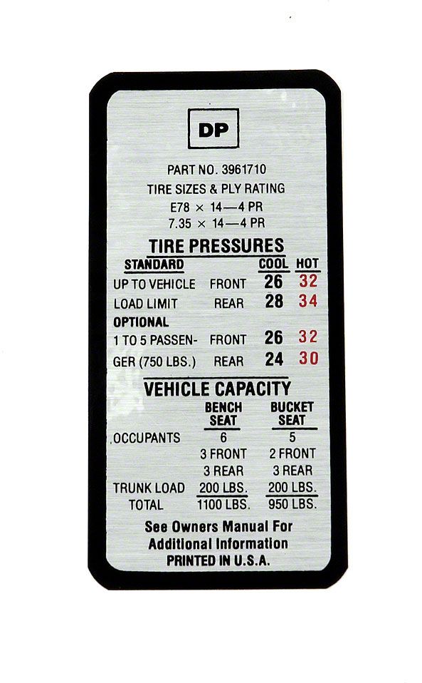 Tire Pressure Decal (1969 Chevelle)