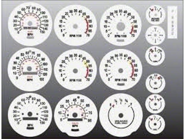 White Face Overlays Included In This Kit: 85 MPH Speedometer,130 MPH Speedometer,150 MPH Speedometer, 7000 RPM Tachometer, Amp Gauge, Clock Gauge, Large Fuel Gauge,Small Fuel Gauge, Volts Gauge, Temperature Gauge