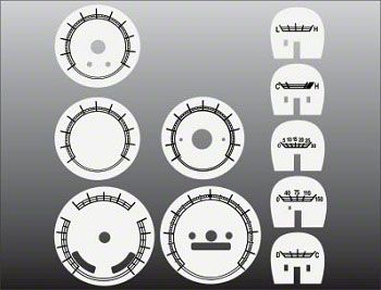 White Face Overlays In This Kit: 100 MPH Speedometer,5000 RPM Tachometer,Temperature Gauge,Large Fuel Gauge,Air Pressure Gauge,Oil Pressure Gauge,Vacuum Gauge,Amp Gauge