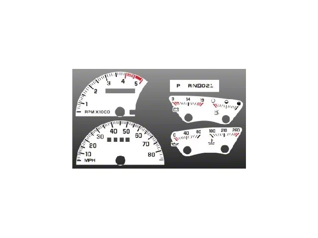 White Face Overlays Included In This Kit: 85 MPH Speedometer,5000 RPM Tachometer,Volts Gauge,Temperature Gauge, Oil Pressure Gauge,Shift Indicator Gauge,Small Fuel Gauge