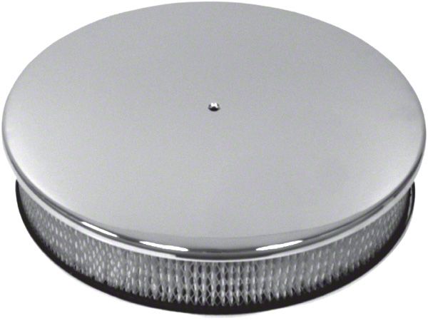 14-Inch Round Aluminum Air Cleaner featuring a smooth chrome top and a recessed base for a clean look! Designed to fit most 4-Barrel Carburetors with 5-1/8-Inch necks. Kit comes complete with a 5-Inch stud and high-flow paper filter element for easy installation.
