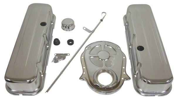 This great looking engine kit from Classic Chevy is the least expensive way to dress up your engine compartment. Includes 1 pair of baffled valve covers, timing chain cover & tab, dipstick & tube, grommets and push-in breather cap.