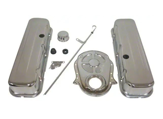 This great looking engine kit from Classic Chevy is the least expensive way to dress up your engine compartment. Includes 1 pair of baffled valve covers, timing chain cover & tab, dipstick & tube, grommets and push-in breather cap.