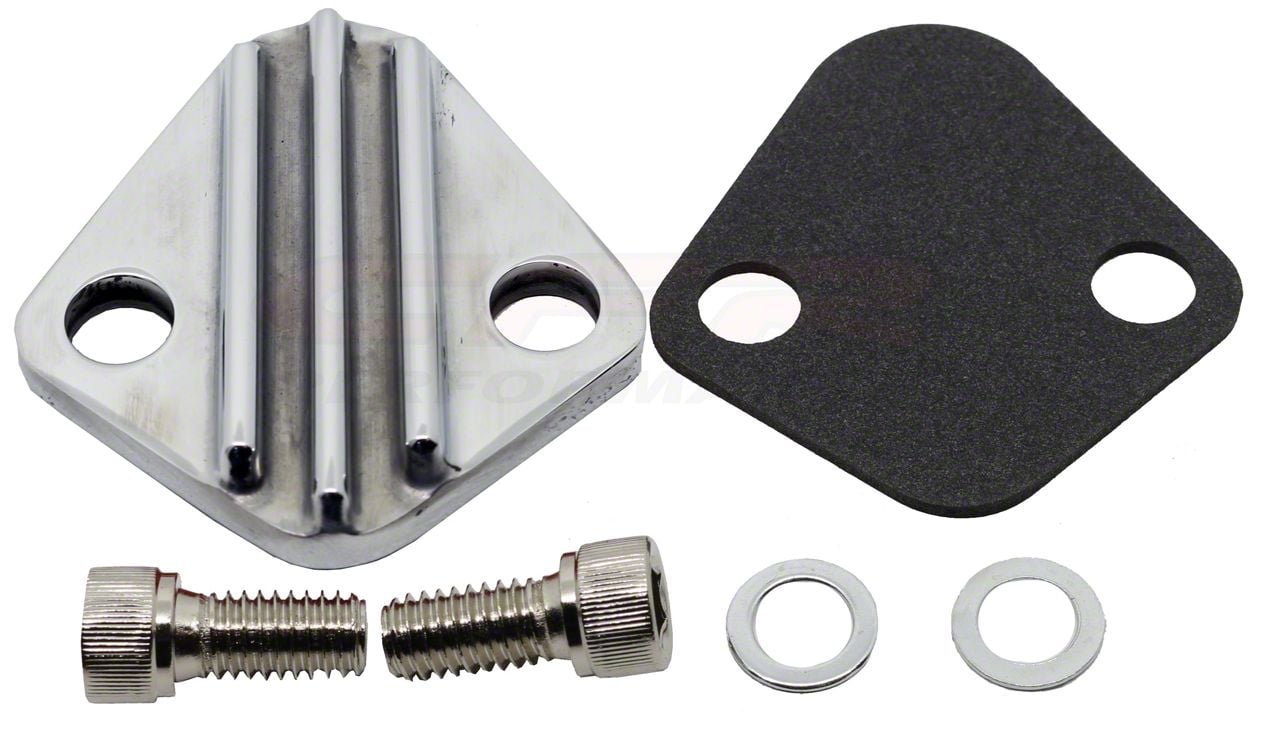 Zinc Alloy finned fuel pump block off plate fits Chevy Big Block engines. It is designed to block off the fuel pump mounting on the cylinder block when a mechanical fuel pump is not used. Includes