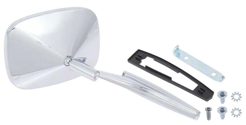 Original style replacement outer door mirror for 1968-72 models, features convex glass. The convex glass helps eliminate the passenger side blind spot. Each rear view mirror features the correct ribbed base and comes with a beautiful chrome finish as original. Includes mirror, bracket, gasket and mounting screws for a complete installation. Fits RH passenger side.