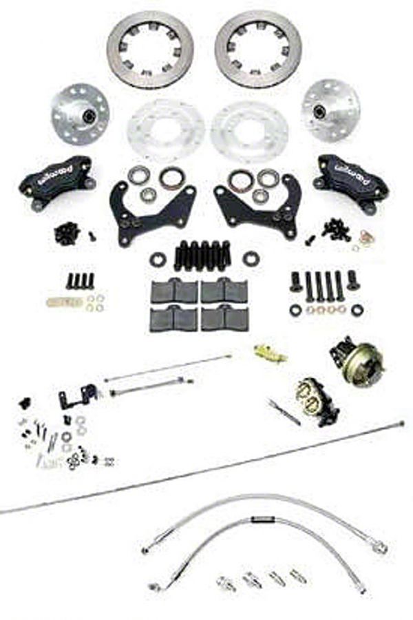 Are you ready for a huge improvement over original, unpredictable four-wheel drum brakes? If you are, then our Wilwood complete power disc brake kit is for you. Our kit includes: large 2-piece 11-3/4" vented rotors, 4-piston aluminum calipers, caliper brackets, pads, bearings, power booster, dual master cylinder, proportioning valve and bracket, prebent lines, stainless steel braided hoses and all hardware needed to install. This kit moves the front wheels outboard 3/4" on each side so keep this in mind for wheel and tire clearance. The unique 2-piece caliper brackets bolt right to your stock spindles with supplied hardware. The super huge 2-piece rotors provide superior braking power as well as a great performance look when used with aftermarket wheels equipped with large slot op