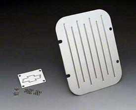 This awesome billet aluminum Chevy bowtie firewall heater block-off plate is a super addition to any custom 1957 Chevy engine compartment. It will install directly into the firewall in the stock heater opening. It includes the smaller plate to block off the original Chevy heater control valve opening. The Chevy bowtie is engraved for a great look. To install, use retainers P/N 54-143. This part is a great complement to Chevy aluminum radiator panels P/N 54-145. Dress up your classic Chevy underhood with our sharp looking polished aluminum Chevy firewall plate.