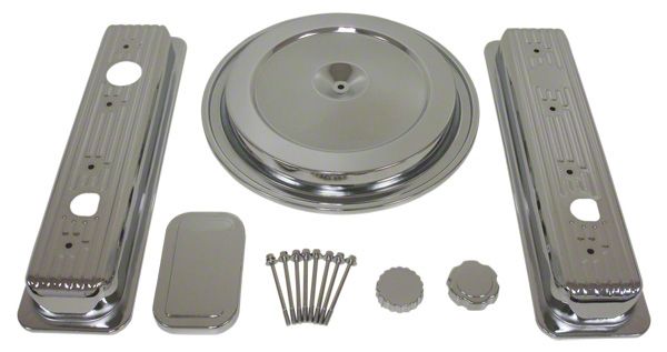 This great looking kit is the least expensive way to dress up your engine compartment. Includes 1 pair of ball milled chrome valve covers, 8 chrome valve cover bolts, chrome air cleaner top, chrome plastic brake cylinder top cover, chrome plastic power steering cap cover, and chrome oil cap.
