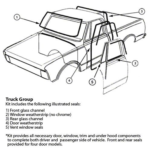 NOTE: This kit is for Custom Series trucks with black moldings on the windshield. If you purchase this kit and decide to add chrome moldings at a later date, you must replace the front and rear windo