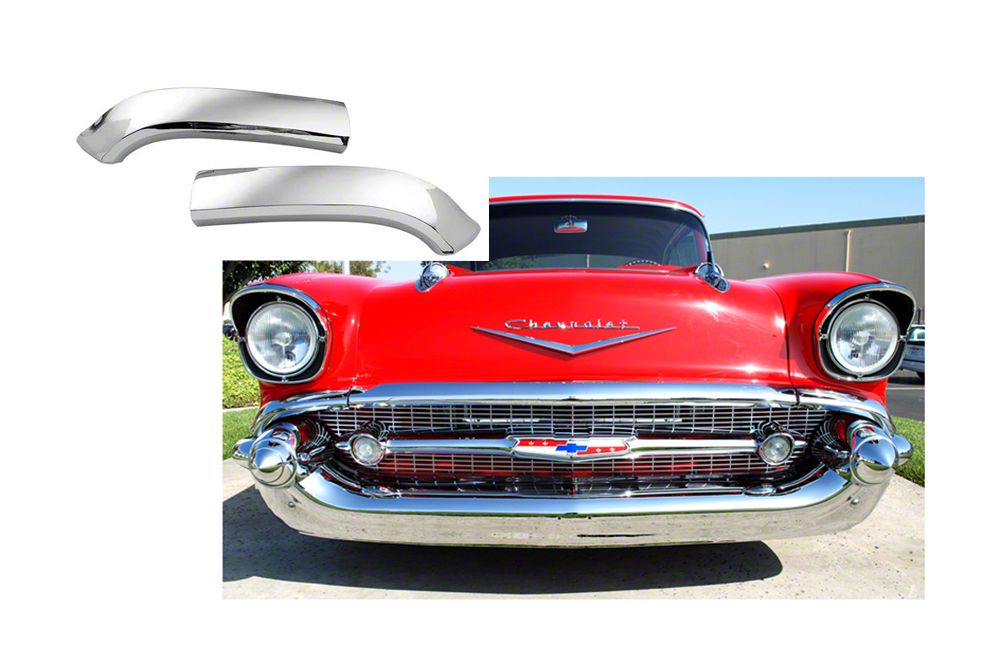 Improved quality hood bar extensions for your 1957 Chevy Bel Air, 150, 210, Nomad or Wagon are just what you need for that custom build. Original GM & GM style reproduction hood bar & Extensions have additional clearance between the hood & fenders. Eckler's Classic Chevy has this improved design for custom cars that makes the molding gap appear more straight. The chrome is flawless as are the castings. Trust Ecklers Classic Chevy for all your Tri-Five parts needs always at the best possible price.