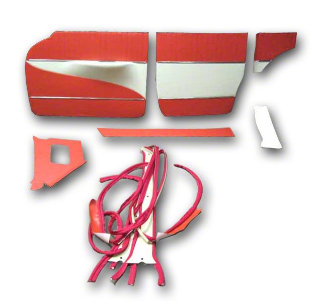 This front and rear side panel set is completely assembled (minus YOUR stainless trim). It is ready to install with nail clips and metal edge door bands. The front armrest covers are presewn into the door panels using new armrest pads and the windlace set is sewn to sponge rod with kraft paper edge. The set also includes vinyl covered kick panels, presewn wheel well covers, rear armrest material and pre-covered over-the-well boards. Customer must provide us with the original metal armrest bases, cleaned and ready to use in the assembly of the door panels. There are new plastic armrest bases available.