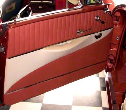 New precision die-cut waterproof door boards with metal edge bands and nails. With Dielectric sealed imprinted lines and matching seat color vinyls. Also includes colored kick panels, sewn front & rear armrests installed, windlace set and rear upper convertible top piston covers. And extra plain vinyls. Door panel stainless trim not included.