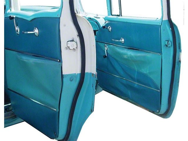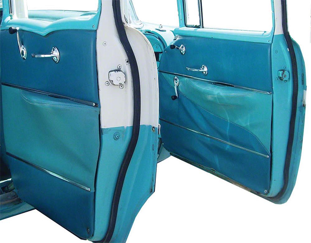 Classic Chevy is proud to offer the highest quality, most accurate reproduction door panel set available for your Classic Bel Air 4-door Sedan. Our front door panels and rear door panels use new die-cut, waterproof boards with edge bands and nails installed. Next, pleated vinyl is attached and sewn armrest bases and rubber pads are painstakingly installed by professional craftsmen with decades of experience. We then add vinyl covered kick panels, cloth covered windlace set with center pillar boards and rear covered dogleg boards to complete this fantastic kit. Our door panel sets are the most complete, most competitively priced and highest quality in the industry. Trust Classic Chevy because we are constantly raising the bar that others can only follow.