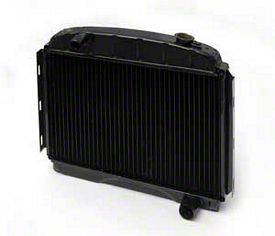 This Chevy copper core 6-cylinder radiator is a very close replacement of the stock original radiator. It is constructed with ½" vertical down-flow cooling tubes on 9/16" centers with a 2" thick core, just like the original. The brass top and bottom tanks are correctly ribbed with the inlet and outlets in the stock location. The 6-cylinder position radiator is flanged to mount in front of the core support bar to give the clearance needed for the longer 6-cylinder engine. This configuration is also handy for long water pump small blocks and big block engine installations. The bottom tank on manual transmission radiators does not include a transmission cooler. In addition, the overflow tube requires the addition of a rubber hose extension in order to dump at the bottom like the steel or