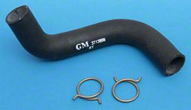 Construction and Appearance. Manufactured from durable rubber that can withstand the heat and pressure typical of a 6-cylinder Chevrolet engine cooling system. This hose features a smooth black finish and comes with factory-style clamps for a secure fit and authentic restoration appearance.