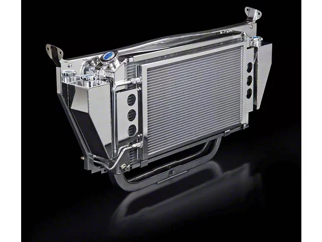 This Chevy Be Cool cross-flow radiator kit will solve all of your cooling dilemmas. This is not just an every day radiator, it is a complete cooling module that includes a highly polished aluminum core support, polished side panels, recovery and reservoir tanks, the highly polished cross-flow radiator, chrome dual 11" electric fans with billet motor covers, stainless steel fan brackets, the fan control harness, polished