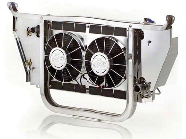 This Chevy Be Cool cross-flow radiator kit will solve all of your cooling dilemmas. This is not just an every day radiator, it is a complete cooling module that includes a highly polished aluminum core support, polished side panels, recovery and reservoir tanks, the highly polished cross-flow radiator, chrome dual 11" electric fans with billet motor covers, stainless steel fan brackets, the fan control harness, radiator ca