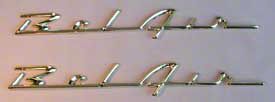 If you are looking for the best quality 1957 Chevrolet gold quarter panel "Bel Air" script emblems for your Bel Air, Nomad or wagon, stop right here because Eckler's Classic Chevy has the best quality you can buy! These superior quality emblems fasten to the quarter inserts on the 1957 Chevy and are forged aluminum just like the originals were. These quarter panel crests are exact duplicates of the original with a bright gold finish. Trust Ecklers Classic Chevy for all your Tri-Five parts needs always at the best possible price.