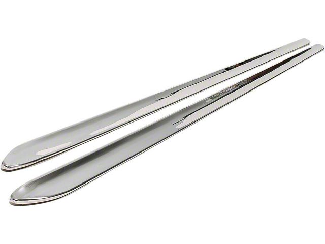 Rocker panel moldings take the brunt of road debris. Flying gravel, ice, salt, sand and mud can leave then battered and scratched. This lower rocker panel molding is simply the best reproduction available for 1953 or 1954 Chevy . Eckler's Early Chevy is pleased to offer these superior moldings. The polished stainless stee; finish and correct contours give a factory appearance. This rocker molding mounts with original or aftermarket clips, not included. Get that showroom new look back for your 1953 or 1954 Bel Air, 150, 210 or Sedan Delivery with reproduction rocker panel moldings from Eckler's Early Chevy.