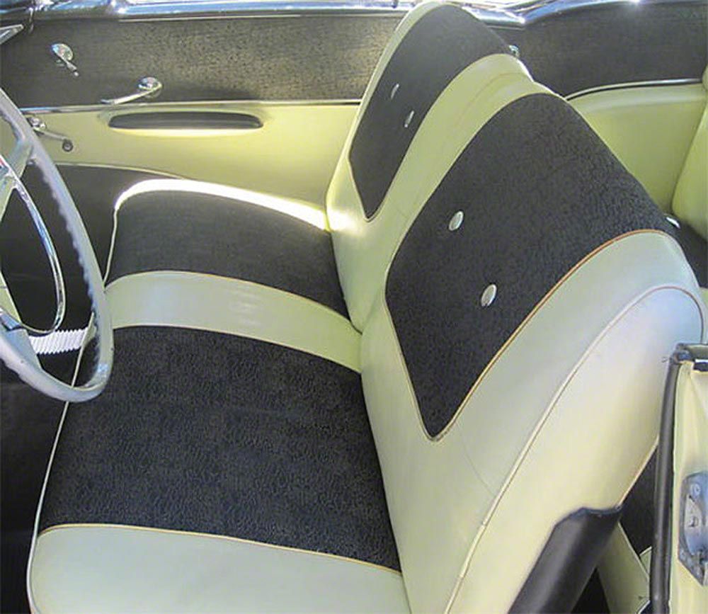 Classic Chevy has spent countless hours researching the top manufacturers today to bring you the highest quality, best constructed and most authentic seat cover for your 1957 Bel Air 2-door hardtop. Our seats covers are constructed in correct heavy weight grain vinyl and exact style cloud pattern weaved black fabric with colored cloud filler thread outlines. Then, the correct tinsel silver welt and sewn listing is attached in the proper areas by skilled craftsmen. These pre-sewn seat covers also include extra seat shell vinyl to complete your seat restoration. Don’t be fooled by low quality, cheap imitations. Your Classic Chevy deserves the very best