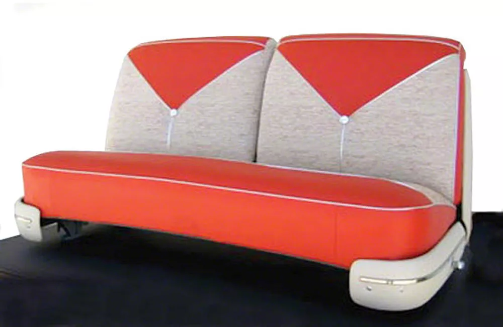 Classic Chevy has spent countless hours researching the top manufacturers today to bring you the highest quality, best constructed and most authentic seat cover for your 1956 Nomad Wagon. Our seats covers are constructed in heavy weight Haricell grain vinyl and correct Bel Air seat cloth with pleated vinyl on the rear of the seat backs. Then, the correct embossed silver welt and sewn listing is attached in the proper areas by skilled craftsmen. These pre-sewn seat covers also include extra seat shell vinyl and four silver Mylar buttons to complete your seat restoration. Don’t be fooled by low quality, cheap imitations. Your Classic Chevy deserves the very best!