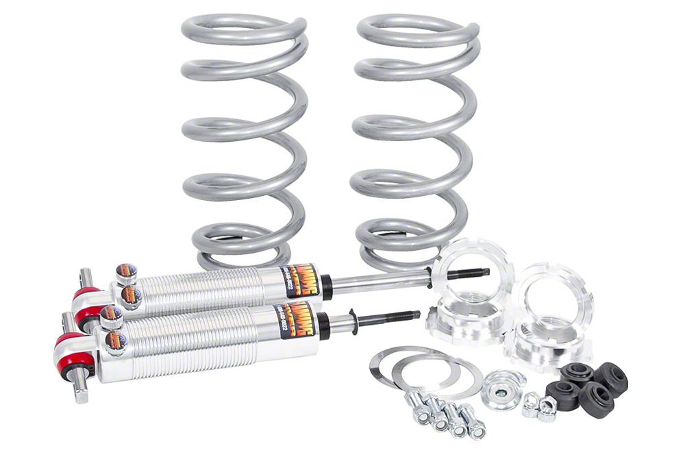 Eckler's Flaming River Chevy Front Coil-Over Shock System includes two (2) lightweight, aluminum dual adjustable shocks, and two (2) lightweight, high-travel springs, plus hardware. Each system allows for independent adjustment of the compression and rebound settings and are available in a variety of spring rates for various driving styles including cruising, road racing and drag racing. All shocks and springs are Made in the USA.