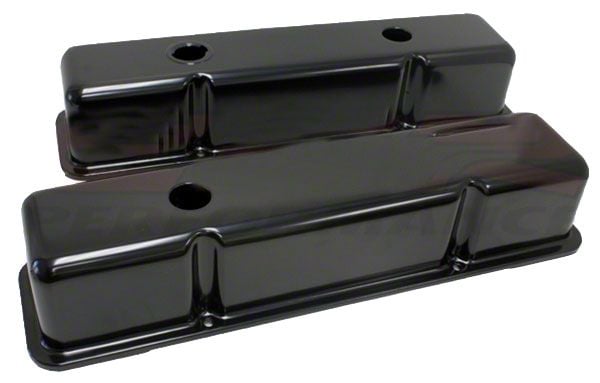 Chevy small block tall painted black steel valve covers fit 1958-86 Chevy 283-305-327-350 small block engines. They are baffled and tall style. One cover has a single 1.25" breather hole, the other side has two holes (one 1.25" breather hole, and one hole for a twist-in cap. Height: 2-5/8 ".
