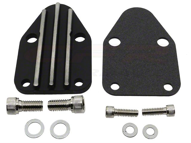 Zinc Alloy finned fuel pump block off plate fits Chevy small block 283-302-305-307-327-350-383 and 400 V8 engines. It is designed to block off the fuel pump mounting on the cylinder block when a mechanical fuel pump is not used. Includes hardware and gasket.