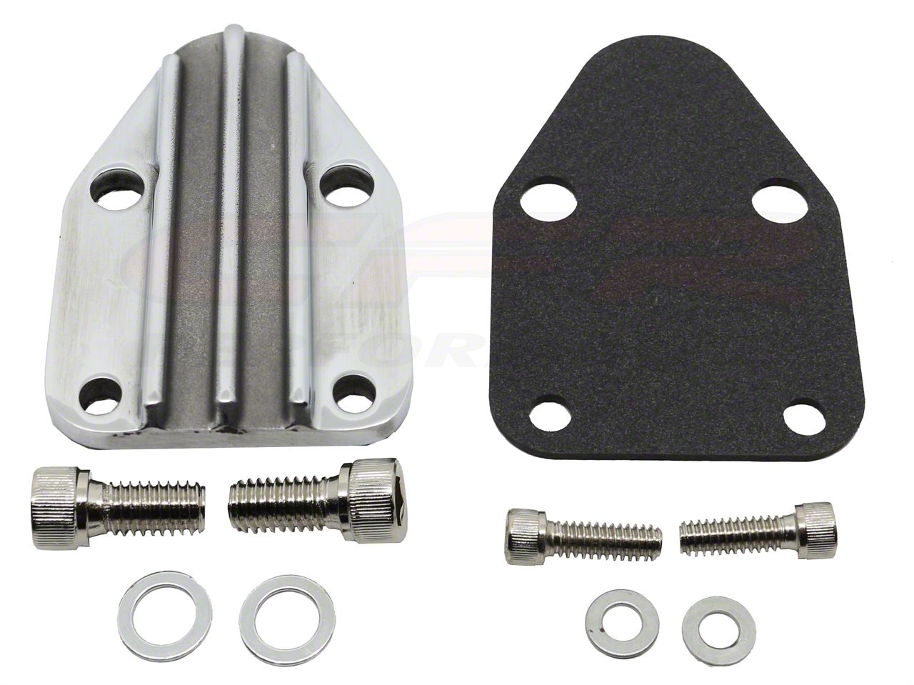 Zinc Alloy finned fuel pump block off plate fits Chevy small block 283-302-305-307-327-350-383 and 400 V8 engines. It is designed to block off the fuel pump mounting on the cylinder block when a mecha