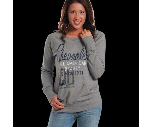 Scoop neck sweatshirt features front pouch pocket and raw edge seams on collar, pocket, and cuffs. Decorated with Chevrolet American Beauty design. Made of 55% cotton/40% polyester/5% spandex for added comfort and stretch.