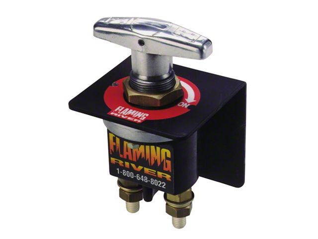 Top racers realize that using a low amp switch creates resistance and actually reduces power. Flaming River's heavy duty battery disconnect switch is top of the line designed for complex electrical systems and 16 Volt batteries. The Big Switches feature a spring-loaded, vibration-resistant, waterproof design and are furnished with an easy-grip T-handle. They are accepted by most sanctioning bodies, including IHRA/NHRA.
