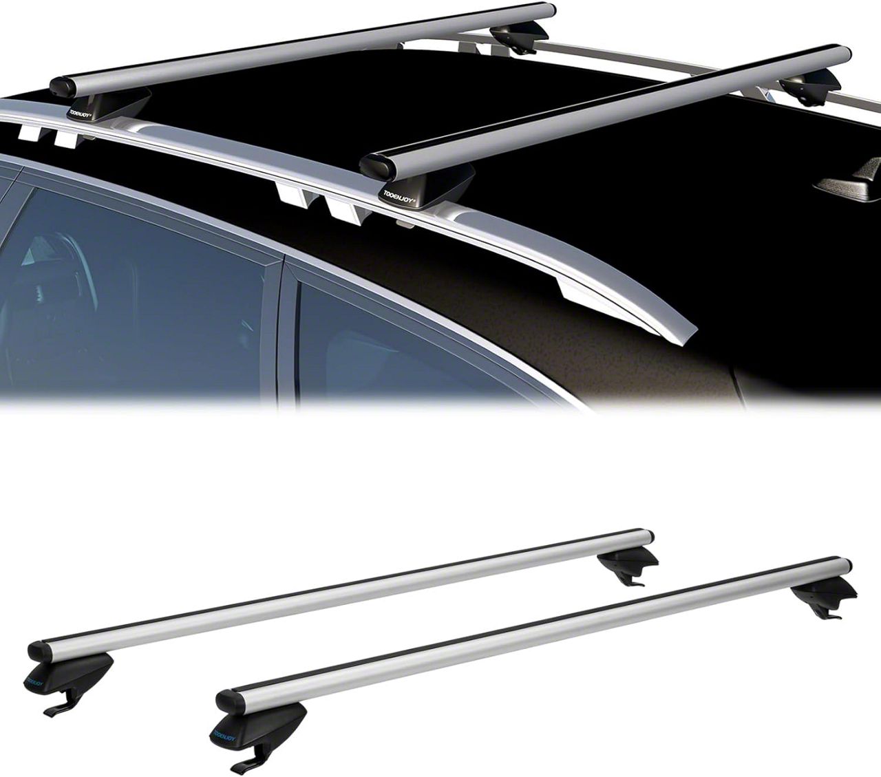 Tooenjoy roof rack crossbars are adjustable from 30.7 inches to 44.9 inches of rail spacing. Compatible with cars and SUVs with raised side rails. Powder-coat finished aluminum, providing scratch resistance and anti-corrosion allowing for years of use. Clamp stand bases with rubber pads secure crossbars firmly on the vehicle side rails and protect the vehicle from scratching. Sturdy enough to carry loads up to 165lbs. Free up inner space of your vehicle and maximize the storage possibility to load camping gear, luggage, fishing poles, bikes, snowboards, skis, and other rooftop accessories.