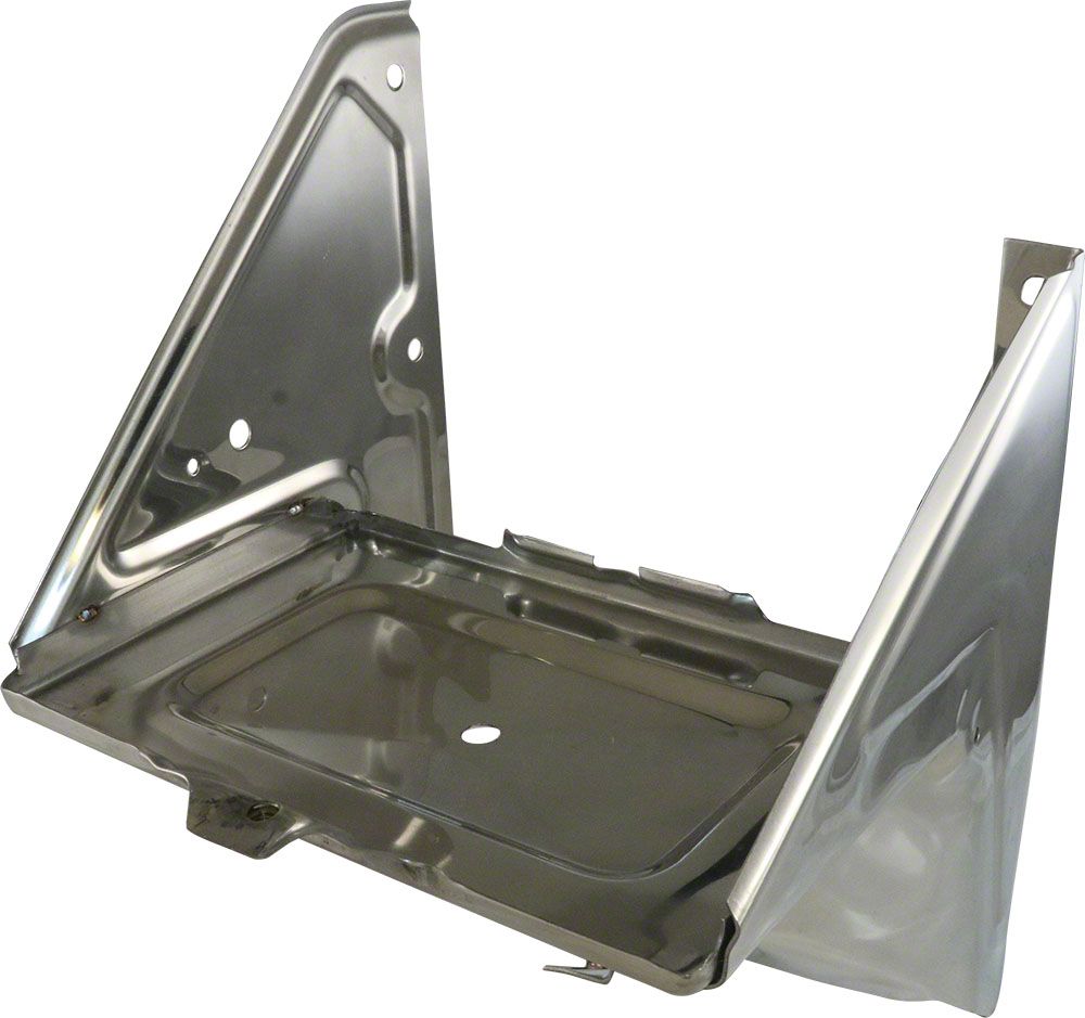 All factory bends and holes have been included in this excellent reproduction of the original. The battery tray assembly bolts to the fire wall through predrilled holes. Drain holes are also drilled in the tray. Polished stainless finish is very shiny, giving it a long-lasting "chrome" look. Hold down and hardware sold separately