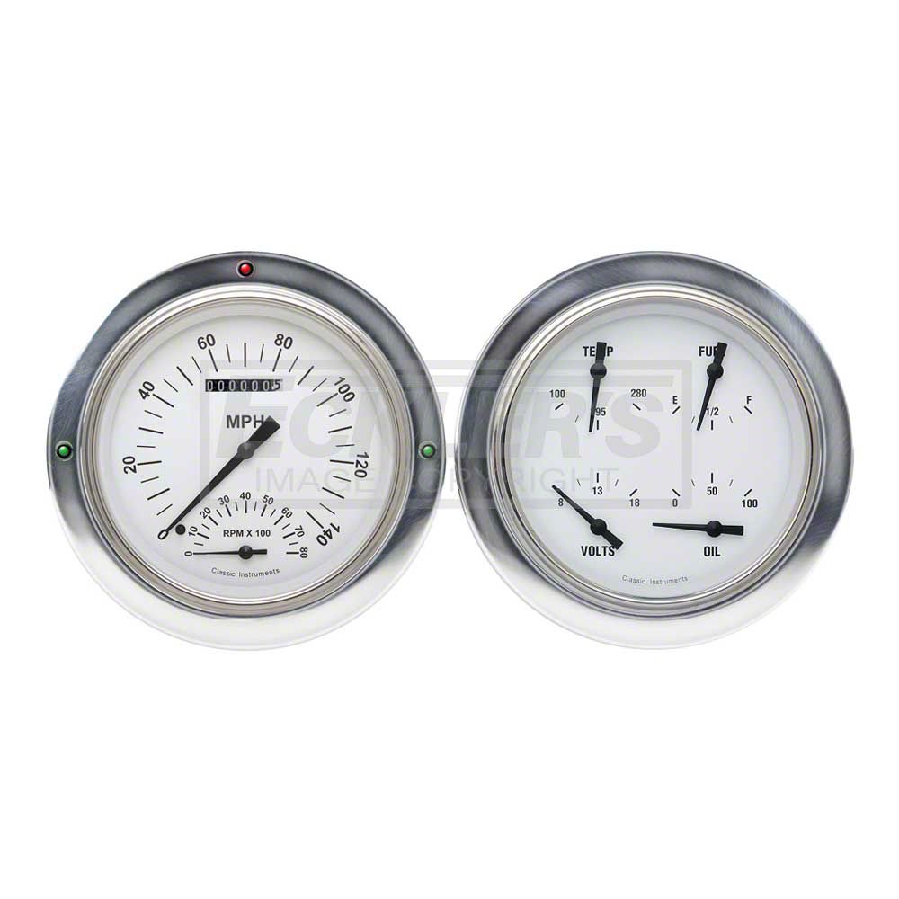 Custom gauges let you update your 1954 or 1955 First Series Chevy Truck's interior in an afternoon. Eckler's Classic Chevy Trucks offers a variety of gauge options designed to help you do just that. The White Hot series gauge set from Classic Instruments features a white face with black pointers. The 140 mph speedometer has a built 8000 RPM tachometer and the quad gauge gives you fuel level, oil pressure, water temperature and volt levels at a glance. Lenses, bezels and senders are included. Let Eckler's Classic Chevy Trucks help you give your 1954 or early 1955 Chevrolet Truck's interior a mini makeover with custom gauge options from Classic Instruments. Note: 5" gauges require 4 5/8" opening.