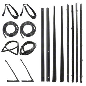 Kit includes: door weatherstrip with mitered corner, upper channel, division post glass run, vent seal kit, black-style small rear window seal, chrome-style windshield seal, beltline kit. Seal your vehicle from the outside elements and reduce noise level while driving simply by replacing your dried-out or cracked door weatherstrip with a proven product that’s accepted in the industry. Made from the oem specs to install and fit for an authentic appearance.