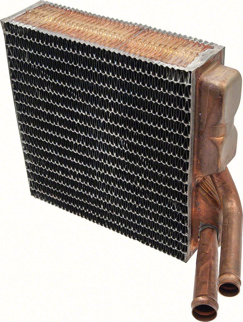 Original reproduction style heater core assembly for use with various 1973-87 Chevrolet, GMC pickup, Blazer, Jimmy, and Suburban models with air conditioning. Each heater core is manufactured to correct factory specifications and features a copper core and brass tank. Replaces original exactly and mounts inside heater box assembly. Be sure to check the original heater core measurements to insure a proper replacement. Measures 7 1/8" x 7 1/2" x 2".