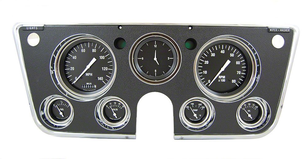 Classic Instruments has raised the bar for excellence and elegance with this new bolt-in gauge kit. This kit features a 5" speedo and tach, 3" clock, 2" fuel, temp, volts, and oil gauges. The fuel gauge is 0-90 ohm for the stock sender. This kit features the classic styling of Classic Instrument's Hot Rod series. With a black face, white lettering and counterbalanced needles, these gauges are a work of art.This kit includes the speedometer, oil pressure, and water temp sending units. The turn signal indicators are in the original location and are included. The high beam indicator is a blue LED located in the speedometer.