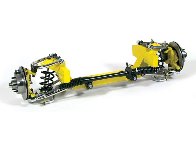 Enjoy the smooth ride and handling of independent suspension and lower your 1955-1959 Chevy Truck 6". This kit features a one piece crossmember (caster and camber adjusted by means of an eccentric), 1” upper and 1-1/8” lower tubular arms with polyurethane bushings, new manual rack and pinion with tie rod ends, adjustable billet coil-overs with black powder coated springs and anti-sway bar, heavy duty forged steel spindles, GM calipers and 11" rotors. Always trust Eckler's Classic Chevy Trucks for all your 1955 1956 1957 1958 1959 Chevy Truck needs!