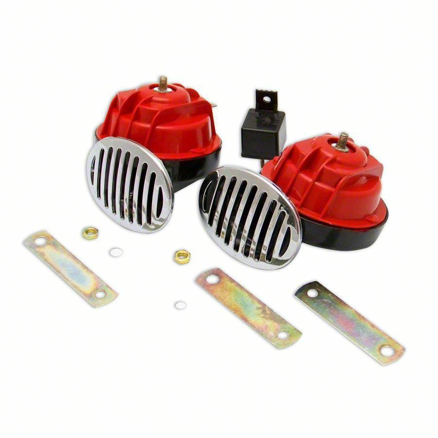 Construction and Appearance. The horn assembly features durable turbine horns coupled with sturdy heavy-duty mounting brackets, ensuring long-lasting performance and a secure fit. The components are crafted for reliability and built to withstand demanding automotive environments.