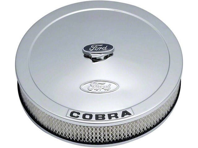 The Ford Cobra Air Cleaner, is the perfect customized look for your ride! The Embossed Ford Cobra Emblem kit is beautifully chrome plated with black inlaid paint. The lid is 13-inches in diameter and includes a Ford Oval logo center nut. This air cleaner kit will really pop under your hood! This is an officially licensed Ford Performance product. Sold as one complete kit.