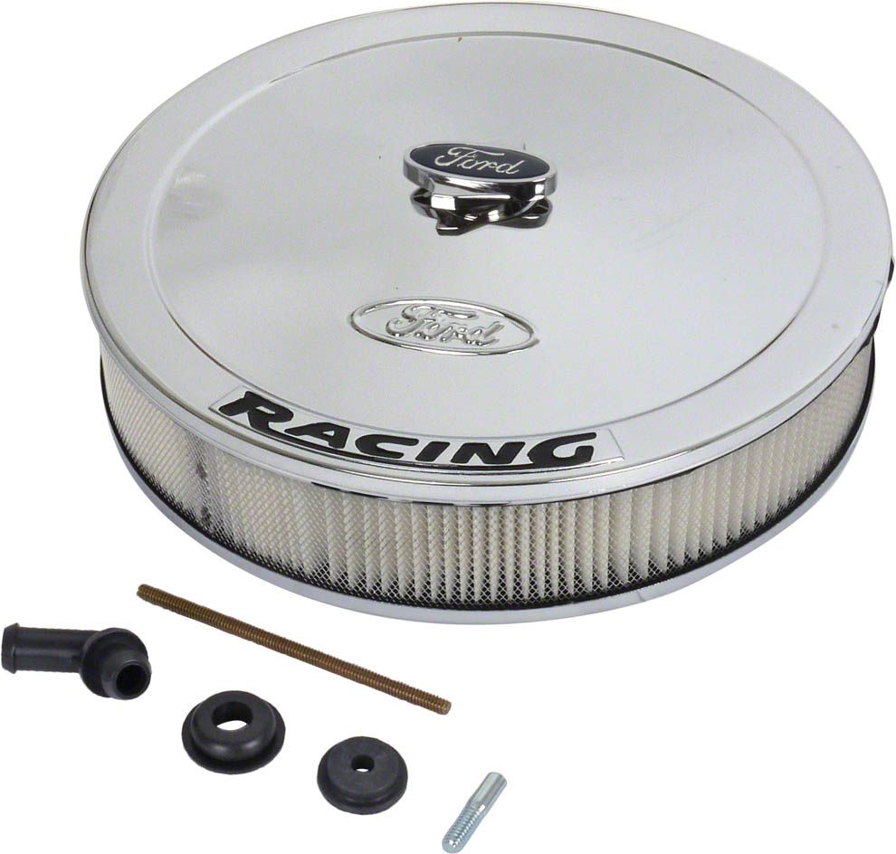 The air cleaner is one of the most visible parts on a car's engine, so now is the time to add a premium Ford RACING emblem to your ride for the perfect customized look! These 13'' diameter air cleaners fit 2V and 4V carburetors, and are supplied with a 2-5/8'' high Motorcraft filter element. Both the tops and bases have matching finishes, and each kit is supplied with necessary mounting hardware. Air cleaner kits are supplied with special die-cast Ford Oval center nuts. For all of your classic Ford needs, you can always count on MAC's.